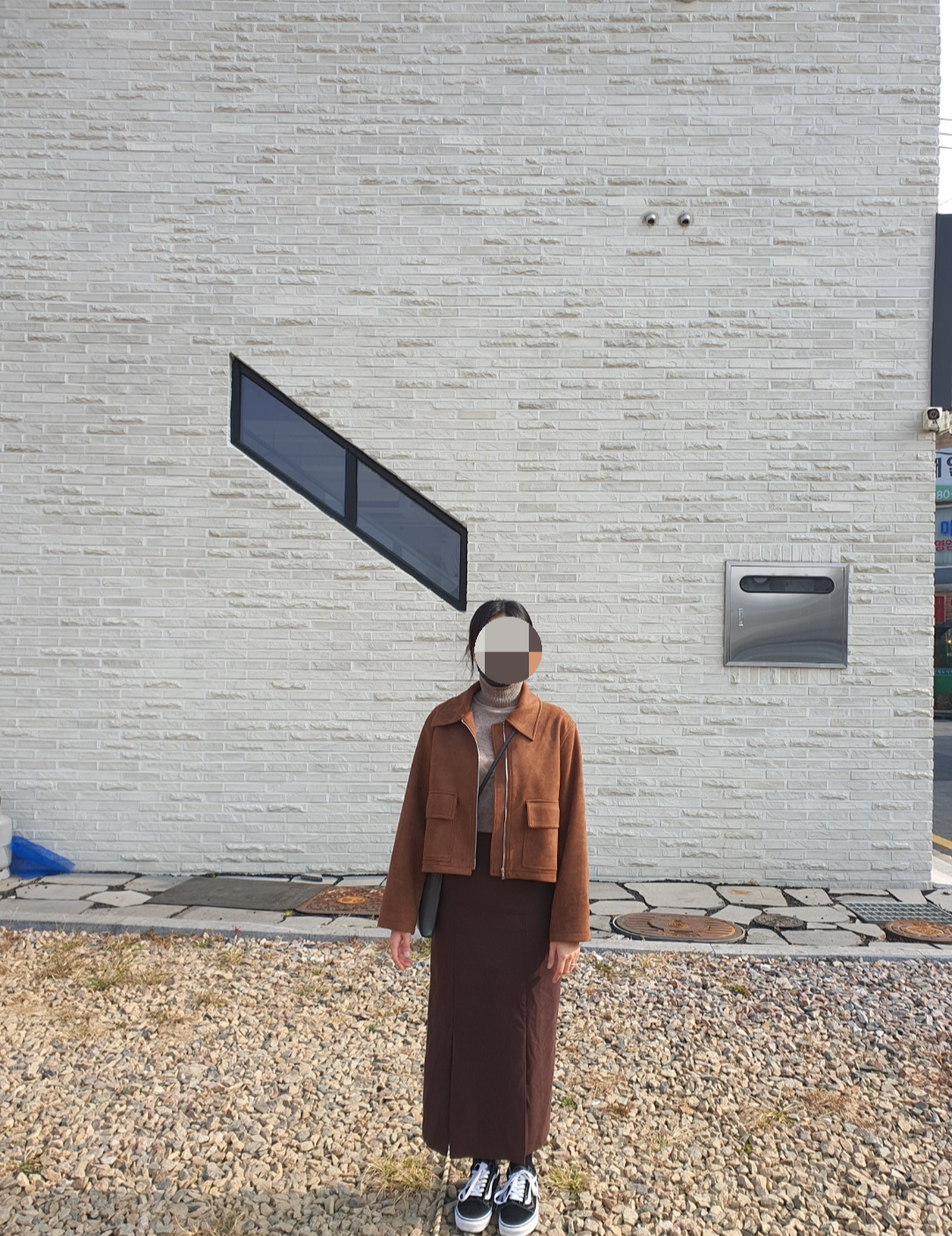 전체적으로 브라운 계열로 맞춰보았어요. 날씨가 쌀쌀해 목폴라티에 긴 스커트를 매칭 했습니다. 이름에서도 알 수 있듯이 스웨이드 소재로 되어 있는 집업 재킷이에요. 스웨이드 소재로 되어 있어 따뜻한 느낌입니다. (그렇다고 따뜻하지는 않아요.) 162cm 키에 딱 맞는 기장이에요. 크롭처럼 짧지는 않답니다.